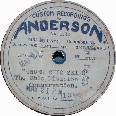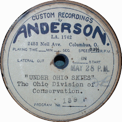 Recordings are from a radio transcription from the 30's or 40's from the old Ohio Division of Conservation, predecessor to the Ohio Division of Wildlife. Any help with pinpointing the year would be appreciated. The transcription (a large record like platter once commonly used by radio stations) was purchased by wildlife officer Tom Bowersox on Ebay for 10.00. The original owner said he picked it up from a radio station in Cleveland, at an auction. We had it dubbed to tape over at Musicol studios, by John Hall, a Columbus recording veteran....John knew the man that owned the studio (Anderson) that transcribed the recording. Anderson studios went out of business in the seventies... The files are .mp3 files, and once downloaded, will play back with Windows Media Player, Realaudio player or your favorite windows mp3 utility, such as Winamp...(some browsers might just go ahead and play the file as well...) The mp3 file can also be played back using a portable mp3 player. Enjoy!